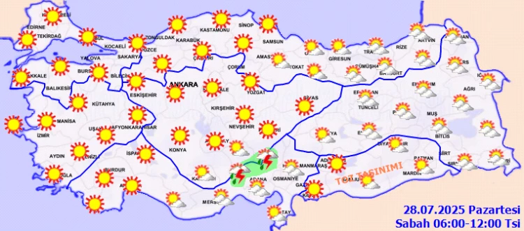 ANKARA (İGFA) - Meteoroloji Genel Müdürlüğü tarafından yapılan tahminlere göre, yurdun doğu kesimlerin parçalı bulutlu, Doğu Akdeniz'in Toroslar kesiminin yerel olmak üzere sağanak ve gök gürültülü sağanak yağışlı, diğer yerlerin az bulutlu ve açık geçeceği tahmin ediliyor. Doğu Anadolu ile Güneydoğu Anadolu’da toz taşınımı bekleniyor.