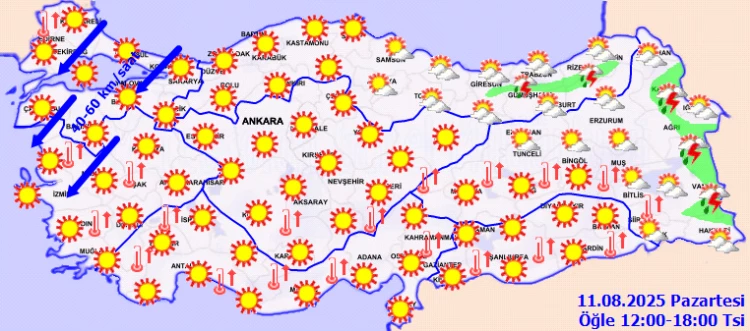 Az bulutlu ve açık geçeceği tahmin ediliyor. Rüzgârın; Kuzey Ege kıyılarında kuzey ve kuzeydoğu yönlerden 40-60 km/saat) esmesi bekleniyor.