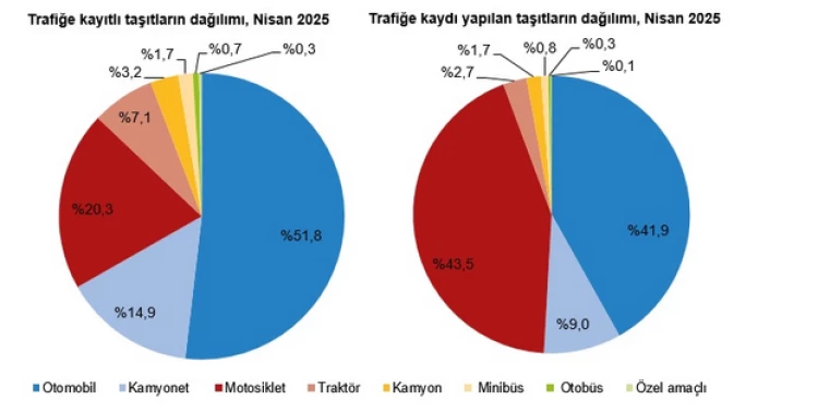 TÜİK verilerine göre, Nisan 2025’te 191 bin 983 taşıt trafiğe kaydedildi. Motosikletler yüzde 43,5, otomobiller yüzde 41,9 pay aldı. Ocak-Nisan döneminde taşıt kayıtları yüzde 16,8 azalırken, toplam trafiğe kayıtlı taşıt sayısı 32 milyona yaklaştı.