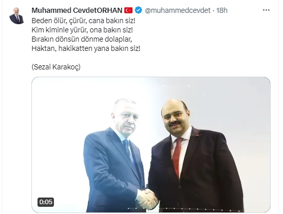 Sosyal Medya Hesabından paylaşımda bulunan M.Cevdet Orhan, Sezai Karakoç’ın şiiri olan ve mısraları anlamlarla yüklü olan, Beden ölür, çürür, cana bakın siz! Kim kiminle yürür, ona bakın siz! Bırakın dönsün dönme dolaplar, Haktan, hakikatten yana bakın siz! Mısralarını paylaşarak birilerine gönderme yaptı.
