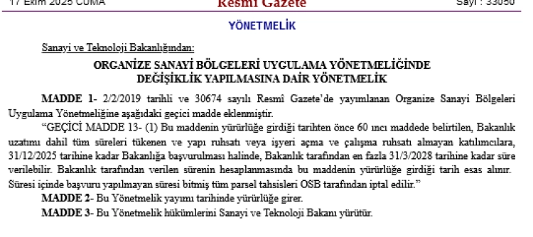 Yeni eklenen Geçici Madde 13 kapsamında; bugünden önce, OSB Uygulama Yönetmeliği’nin 60. maddesinde belirtilen ve Bakanlıkça yapılan uzatmalar da dahil olmak üzere tüm süreleri sona eren katılımcılar, 31 Aralık 2025 tarihine kadar Sanayi ve Teknoloji Bakanlığı'na başvurmaları halinde, kendilerine en fazla 31 Mart 2028 tarihine kadar süre verilebilecek.