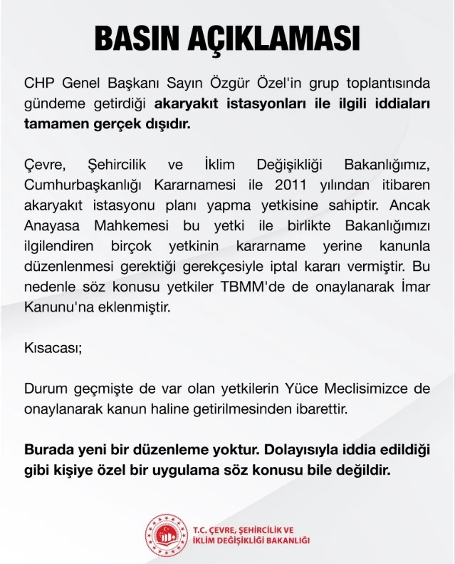 Çevre, Şehircilik ve İklim Değişikliğ Bakanlığın sosyal medya hesabından yaptığı paylaşımda şu ifadelere yer verildi: CHP Genel Başkanı Sayın Özgür Özel'in grup toplantısında gündeme getirdiği akaryakıt istasyonları ile ilgili iddiaları tamamen gerçek dışıdır