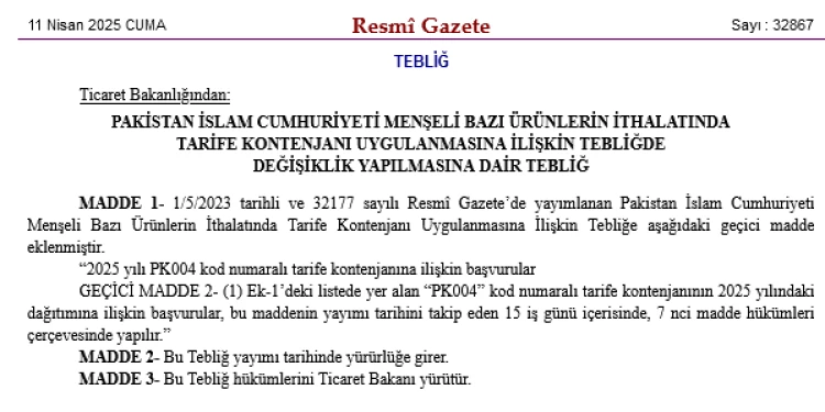 Ticaret Bakanlığı, Pakistan menşeli ürünlerin ithalatında 2025 yılı tarife kontenjanı başvurularının 15 iş günü içinde yapılacağını duyurdu.