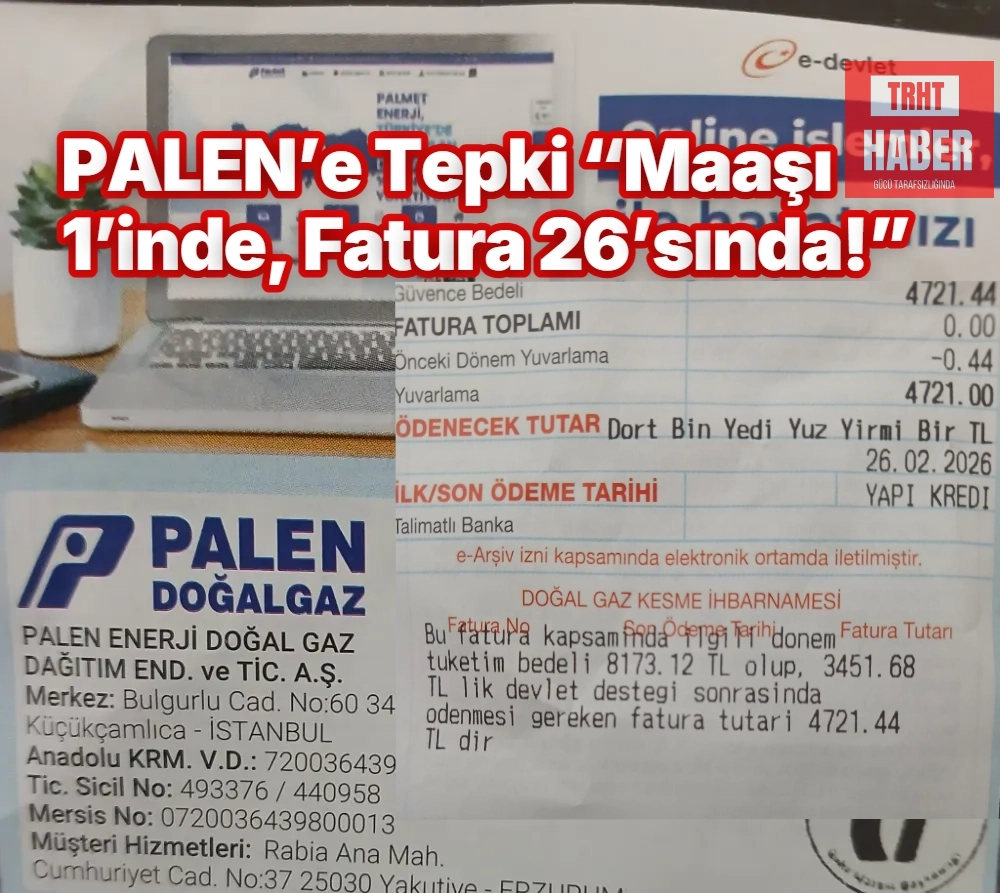 TRHT: ERZURUM GÜNDEM – Sabit gelirle geçinen emekli memurlar, doğalgaz faturalarında yapılan son ödeme tarihi değişikliğine sert tepki gösterdi. İddialara göre, bölgesel dağıtım şirketi PALEN Enerji Doğalgaz Dağıtım AŞ, daha önce her ayın 1’i olan son ödeme tarihini 5 gün öne çekerek ayın 26’sına aldı.