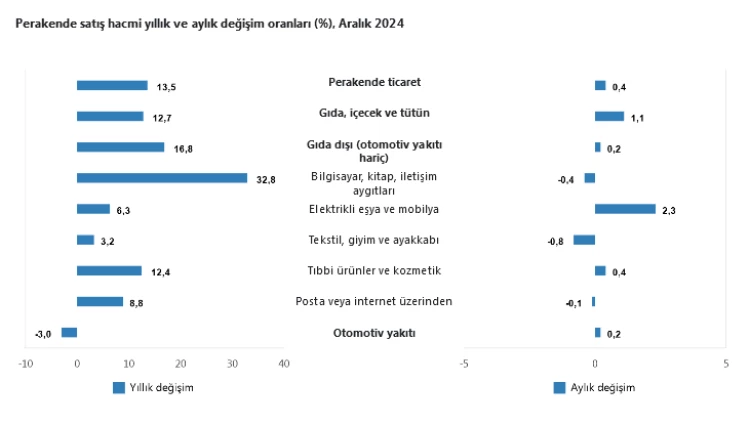 Aylık bazda perakende satışlarda en çok elektrikli eşya ve mobilyada artış yaşanırken, yıllık bazda ise bilgisayar, kitap, iletişim aygıtları gibi teknolojik ürünler başı çekti.