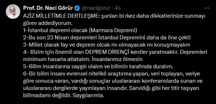 23 Nisan 2025 tarihinde yaşanan depremlerin bu riski daha da öne çektiğini vurgulayan Prof. Dr. Görür, “Millet olarak ‘deprem olacak mı, olmayacak mı’ tartışmasını bırakalım. Önemli olan deprem dirençli kentler yaratmaktır. Depremleri minimum hasarla atlatalım. İnsanlarımız ölmesin” dedi.