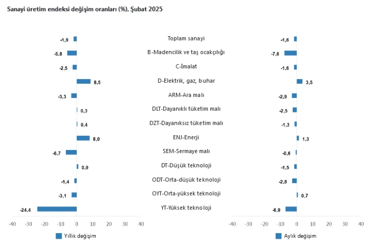 TÜİK, Şubat 2025 Sanayi Üretim Endeksi verilerini açıkladı. Verilere göre, sanayi üretimi yıllık bazda yüzde 1,9 azalırken, aylık bazda ise yüzde 1,6 düşüş gösterdi.