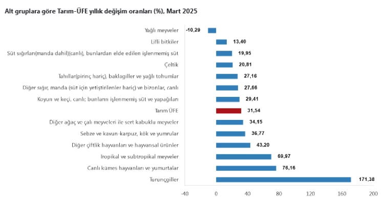 Türkiye’de Tarım-ÜFE Mart 2025 verileri, tarım ürünlerinde fiyat artışlarının devam ettiğini ve özellikle turunçgiller ile meyve grubunda rekor seviyelerde yükseliş yaşandığını ortaya koydu.