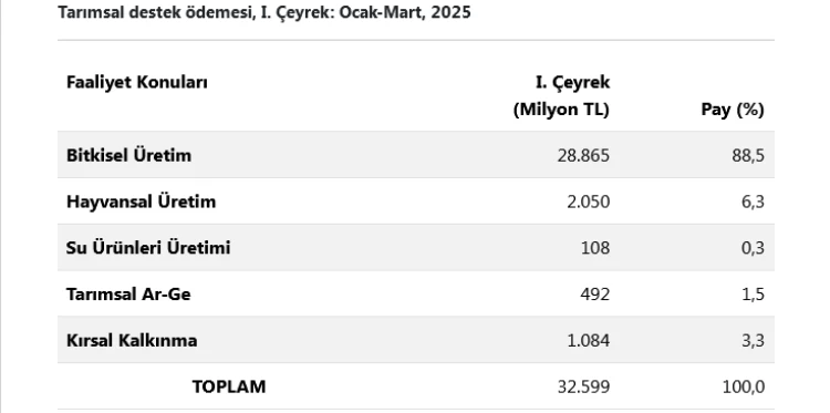 Tarım ve Orman Bakanlığı, 2025 yılının ilk çeyreğinde çiftçilere 32,6 milyar TL tarımsal destek ödemesi yaptı. Ödemelerin yüzde 88,5’i bitkisel üretime, yüzde 6,3’ü hayvansal üretime, yüzde 3,3’ü kırsal kalkınmaya ayrıldı.