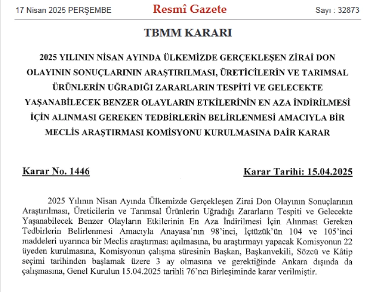 ANKARA (İGFA) - Türkiye'de gerçekleşen zirai don olayının tüm yönleriyle araştırılması amacıyla Meclis Araştırma Komisyonu kurulmasına ilişkin karar, Resmi Gazete'de yayımlandı.