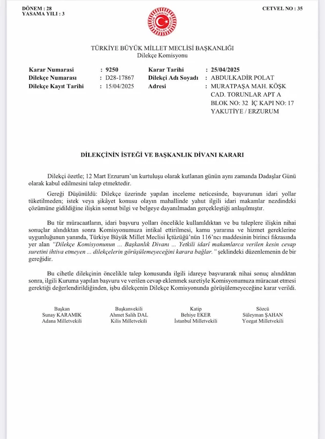 Adana Milletvekili Sunay Karamık başkanlığında yürütülen Dilekçe Komisyonu'nda görevli, Başkan vekili Kilis milletvekili Ahmet Salih Dal, Katip İstanbul Milletvekili Behiye Eker, Sözcü Yozgat Milletvekili Süleyman Şaha, tarafından kabul edilmeyen 12 Mart gününün"Dadaşlar günü"olarak kabul edilmesi talep dilekçesi TBMM iç tüzüğünün 116.maddesinin 1.fıkrası gerekçe gösterilerek RET edildi.