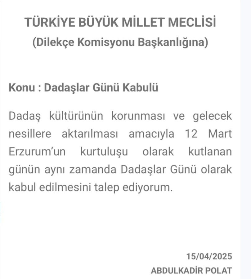 Her yıl Erzurum ilinin Kurtuluş Savaşı yıllarında 1916 yılında başlayan Rus işgalinden kurtuluş günü olan 12 Mart 1918 tarihinin yıl dönümünde kutlanan il kurtuluşunun törenleri adının Dadaşlar günü olarak resmi törenlerde adının geçmesi için TBMM 'ne yapılan başvuru Dilekçe komisyon başkanlığı tarafından ret edildi.