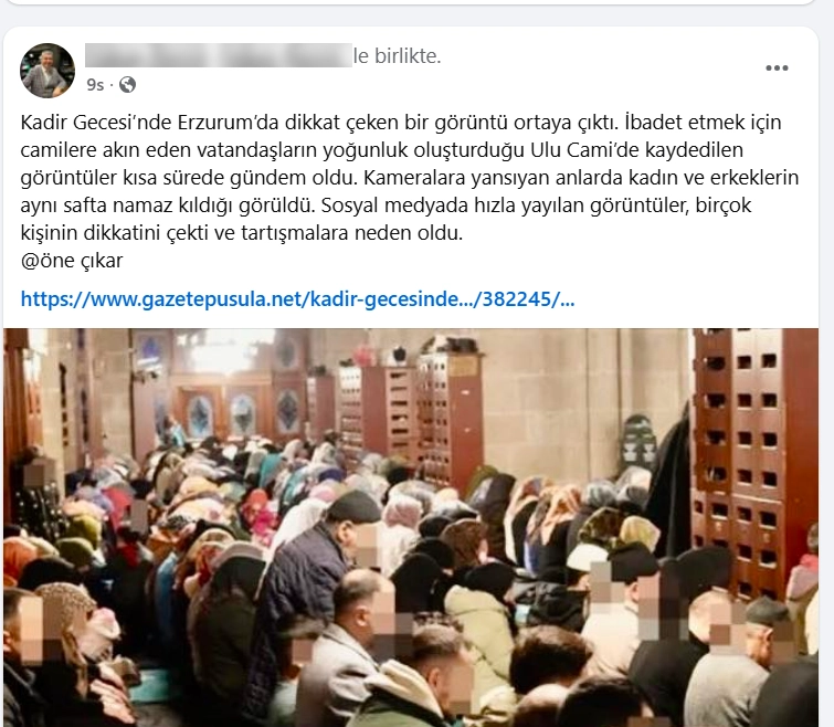 Paylaşımda, ibadet için camilere akın eden vatandaşların yoğunluk oluşturduğu Erzurum Ulu Cami’de kaydedildiği ifade edilen görüntülere yer verildi. Görüntülerde kadın ve erkeklerin aynı safta namaz kıldığı iddiası öne çıkarılırken, bu durum sosyal medyada farklı yorumlara neden oldu.