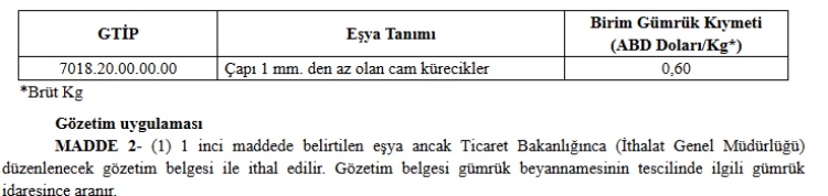 ANKARA (İGFA) - Ticaret Bakanlığı, çapı 1 mm’den küçük cam küreciklerin (GTİP: 7018.20.00.00.00) ithalatında, birim gümrük kıymeti 0,60 ABD Doları/kg altında olanlar için gözetim belgesi şartı getiren tebliği bugünkü Resmi Gazete’de yayımladı.