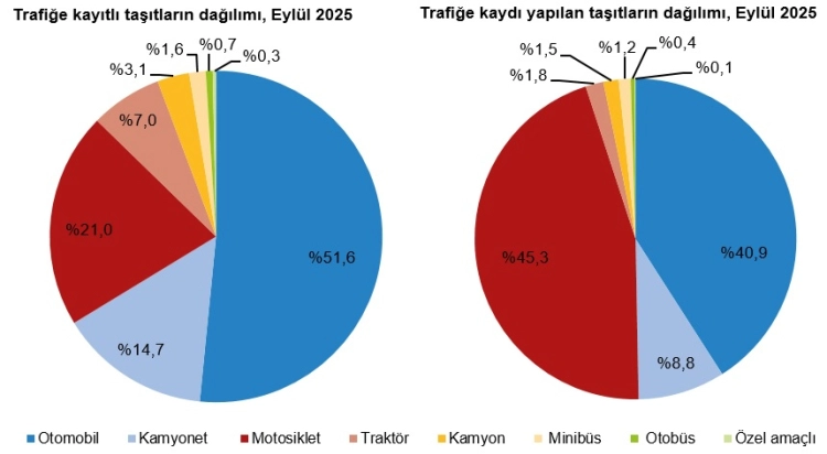 Eylül 2024'e göre karşılaştırıldığında, trafiğe kayıtlı yeni taşıt sayısında yüzde 7,6’lık bir azalma görüldü. Yıllık bazda en fazla artış, özel amaçlı taşıtlarda (yüzde 77,5) gerçekleşirken, traktör (-yüzde 43,1) ve motosiklet (-yüzde 26,4) kayıtlarında sert düşüşler yaşandı.