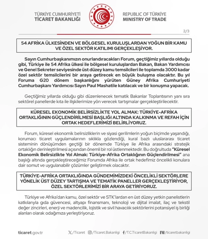 Ticaret Bakanlığı, “Türkiye-Afrika İlişkilerini Güçlendirerek Ortak Kazanımları Paylaşmak” mottosuyla V. Türkiye-Afrika İş ve Ekonomi Forumu, 16-17 Ekim 2025’te İstanbul Kongre Merkezi’nde (ICEC) düzenlenecek. Forum heyecanını paylaşan Bakanlık, Afrika ülkeleriyle ekonomik iş birliğini güçlendirmeyi hedeflediklerini kaydetti.