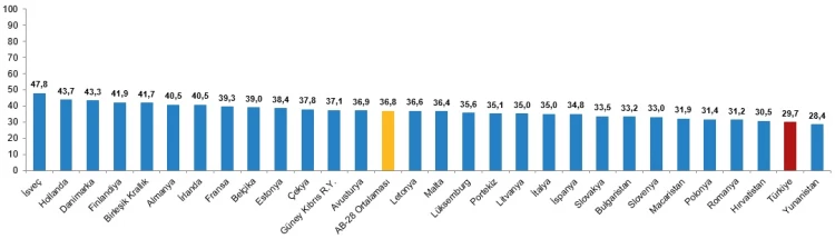 Türkiye’nin 2024 AYE değeri 29,7’ye yükselirken, 2023’te 28,7’ydi. AB ortalaması (36,8) üzerinde olmayan Türkiye, erkeklerde 34,5, kadınlarda 25,3 endeks değeriyle cinsiyet farkı gösterdi.
