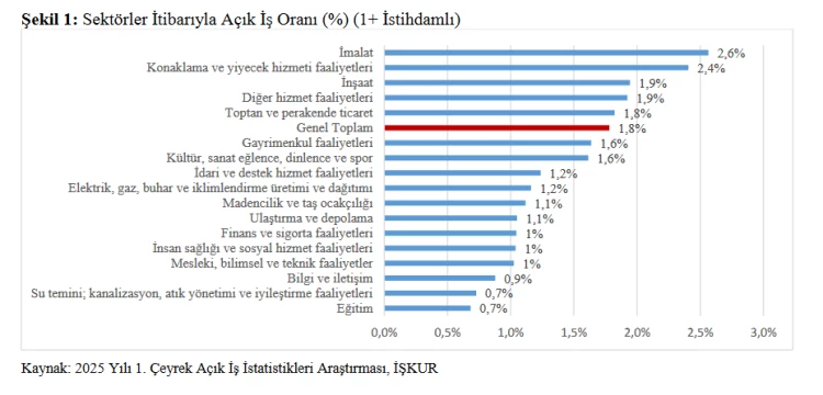 Raporda, en fazla işçi talep eden sektörlerin imalat, konaklama ve yiyecek hizmeti faaliyetleri ile inşaat olduğu belirtilirken en yüksek açık iş oranına sahip sektörler de, bu alanlar olarak öne çıktı.