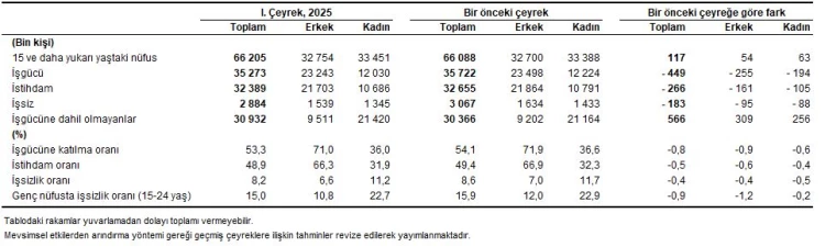 TÜİK verilerine göre, 2025 yılı Ocak-Mart döneminde işsizlik oranı yüzde 8,2’ye düşerken, istihdam oranı yüzde 48,9, işgücüne katılma oranı ise yüzde 53,3 oldu. Genç nüfusta işsizlik yüzde 15’e geriledi, atıl işgücü oranı ise yüzde 28,5’e yükseldi.