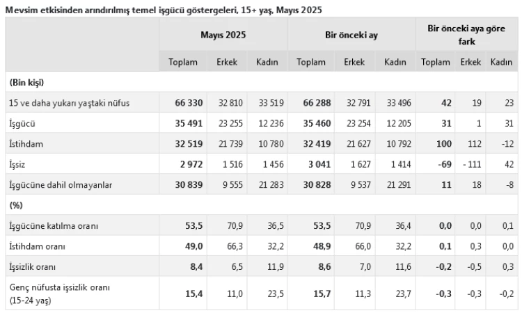Hanehalkı İşgücü Araştırması’na göre, Mayıs 2025’te işsiz sayısı 69 bin kişi azalarak 2 milyon 972 bine düştü. İşsizlik oranı yüzde 8,4 seviyesine inerken, istihdam oranı ise yüzde 49'a ulaştı.