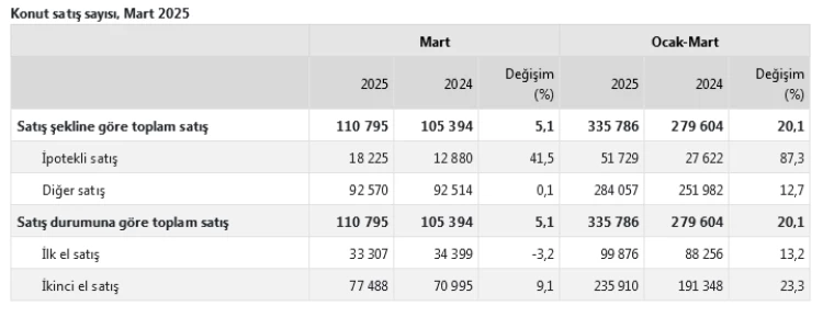 Türkiye genelinde Mart ayında 110 bin 795 konut satıldı. İpotekli satışlar yüzde 41,5, ikinci el satışlar yüzde 9,1 artarken, yabancılara satışlar yüzde 11,5 azaldı. İstanbul, 19 bin 820 satışla liderliğini korudu.