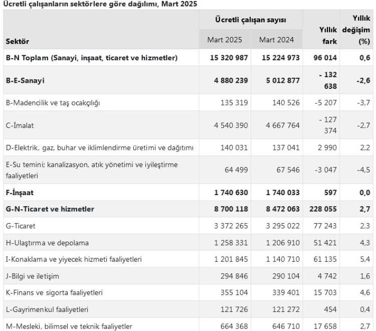 Türkiye’de ücretli çalışan sayısı Mart 2025’te geçen yıla göre yüzde 0,6 artarak 15 milyon 321 bine ulaşırken aylık bazda yüzde 0,2 düşüş yaşandı. Sanayi ve inşaatta azalma, ticaret-hizmette artış gözlendi.