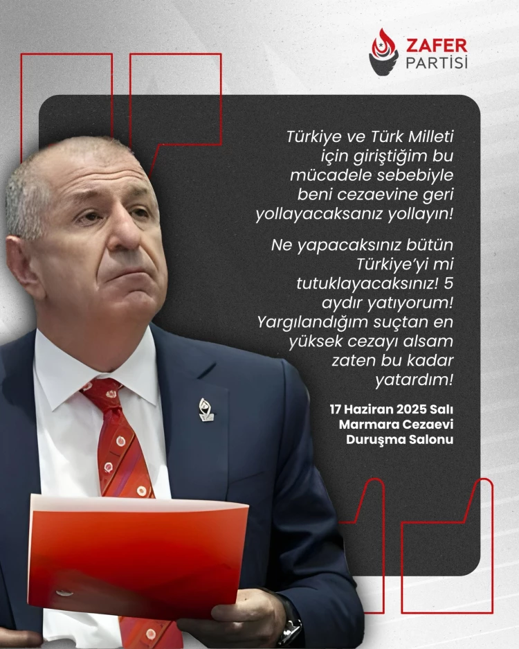 Mücadele kararlılığını vurgulayan Özdağ, “Türkiye ve Türk Milleti için verdiğim bu mücadele nedeniyle beni cezaevine geri yollayacaksanız, yollayın! Bütün Türkiye’yi mi tutuklayacaksınız? 5 aydır yatıyorum, bu suçtan en yüksek cezayı alsam zaten bu kadar yatardım!” şeklinde savunma yaptı.