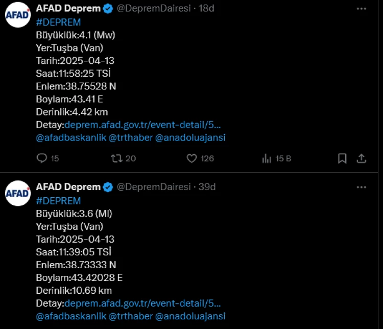 ANKARA - AFAD'ın paylaştığı bilgiye göre, saat 11.39 ile saat 11.58'de merkez üssü Van'ın Tuşba ilçesinde iki farklı deprem kaydedildi.
