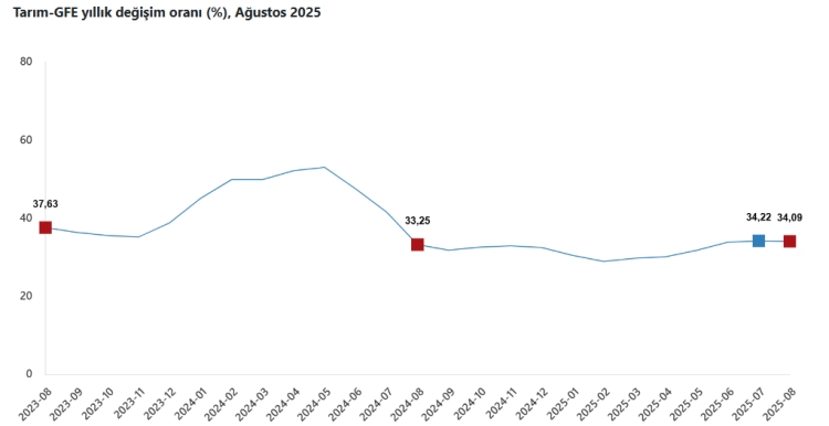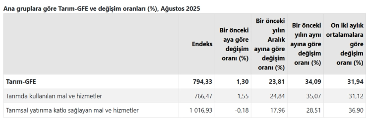 TRHT ANKARA - TÜİK'in verilerine göre, Ağustos 2025'te Tarım-GFE'de (2020=100), 2025 yılı Ağustos ayında bir önceki aya göre yüzde 1,30 artış, bir önceki yılın Aralık ayına göre yüzde 23,81 artış, bir önceki yılın aynı ayına göre yüzde 34,09 artış ve on iki aylık ortalamalara göre yüzde 31,94 artış gerçekleşti.