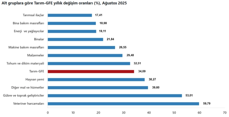 Türkiye İstatistik Kurumu (TÜİK), Ağustos 2025 Tarım Girdi Fiyat Endeksi'ni (Tarım-GFE) açıkladı.