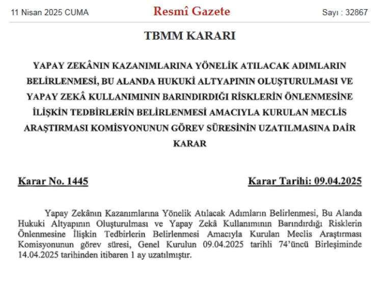 Yapay Zekânın Kazanımlarına Yönelik Atılacak Adımların Belirlenmesi, Bu Alanda Hukuki Altyapının Oluşturulması ve Yapay Zekâ Kullanımının Barındırdığı Risklerin Önlenmesine İlişkin Tedbirlerin Belirlenmesi Amacıyla Kurulan Meclis Araştırması Komisyonunun görev süresi 1 ay uzatıldı.