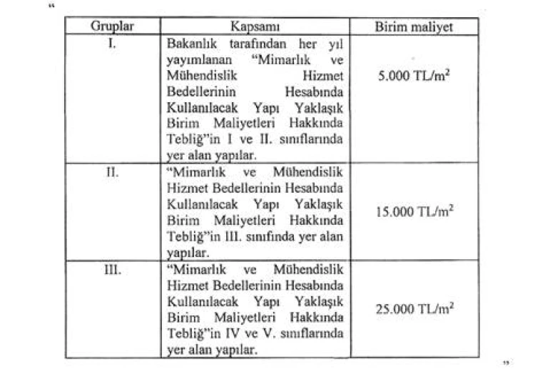 Hizmet Bedeli: 500 metrekareye kadar işlerde bedel oranı yüzde 3,5’e kadar artırılabilecek. Birim maliyetler, 2026’dan itibaren Yİ-ÜFE ve TÜFE ortalamasıyla güncellenecek. Güçlendirme işlerinde hizmet bedeli, toplam bedelin yüzde 25’inden az olmayacak.