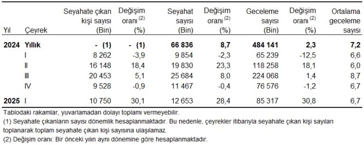 ANKARA (İGFA) - Türkiye İstatistik Kurumu (TÜİK), 2025 yılının ilk çeyreğinde (Ocak-Mart) yurt içinde ikamet eden 10 milyon 750 bin kişinin seyahate çıktığını açıkladı.