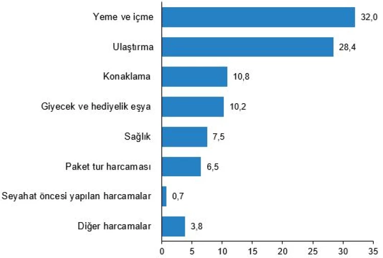 Yerli turistlerin seyahat harcamaları, bir önceki yıla göre yüzde 68,9 artarak 76 milyar 429 milyon 290 bin TL’ye yükseldi. Harcamaların yüzde 93,5’i (71 milyar 457 milyon TL) kişisel, yüzde 6,5’i (4 milyar 971 milyon TL) ise paket tur harcamalarından oluştu. Seyahat başına ortalama harcama 6 bin 40 TL oldu. Harcamalarda en büyük pay yüzde 32 ile yeme-içme, yüzde 28,4 ile ulaştırma ve yüzde 10,8 ile konaklama harcamalarına ait. Bu kalemlerdeki artış oranları sırasıyla yüzde 62,5, yüzde 66,3 ve yüzde 66,7 olarak gerçekleşti.