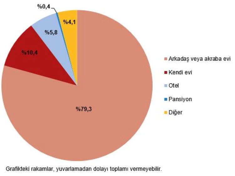 Konaklamada en çok tercih edilen yer, 67 milyon 654 bin gecelemeyle arkadaş veya akraba evi oldu.
