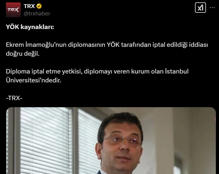 YÖK kaynaklarından alınan bilgiler doğrultusunda: Ekrem İmamoğlu’nun diplomasının YÖK tarafından iptal edildiği iddiasının doğru olmadığı,