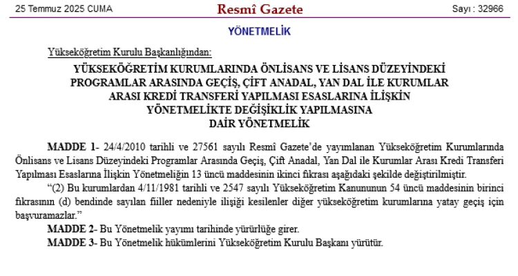 ANKARA (İGFA) - Yükseköğretim Kurulu Başkanlığı, bugünkü Resmi Gazete’de yayımlanan yönetmelik değişikliği ile yükseköğretim kurumları arasındaki yatay geçiş kurallarına yeni bir düzenleme getirdi.