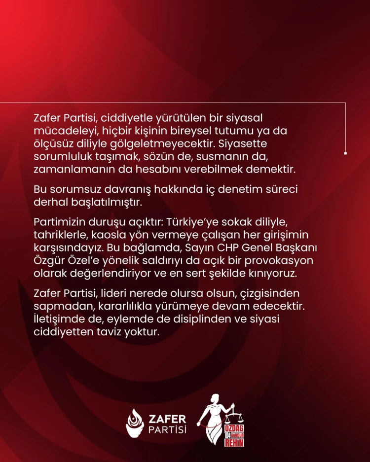 Öte yandan Türkiye’de sokak diliyle ve tahriklerle kaos yaratma çabalarına karşı olduklarını vurgulayan Zafer Partisi, CHP Genel Başkanı Özgür Özel’e yapılan saldırıyı provokasyon olarak nitelendirip sert şekilde kınadı. Zafer Partisi, disiplin ve siyasi ciddiyetten taviz vermeden yoluna devam edeceğini ifade etti.