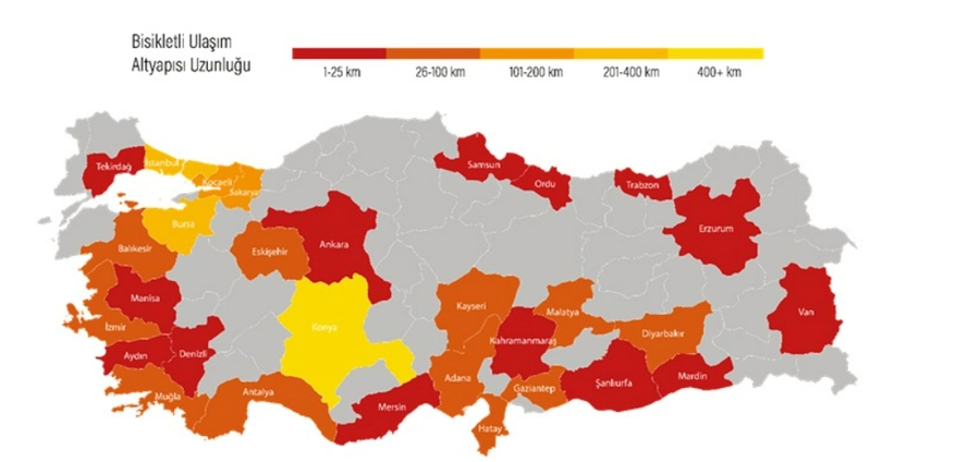 Türkiye’de en uzun bisiklet yolu altyapısı 550 km’lik bisiklet yolu ile Konya’da bulunmaktadır. Konya’nın ardından sırasıyla Bursa (368 km), İstanbul (314 km) ve Sakarya (169 m) şehirleri