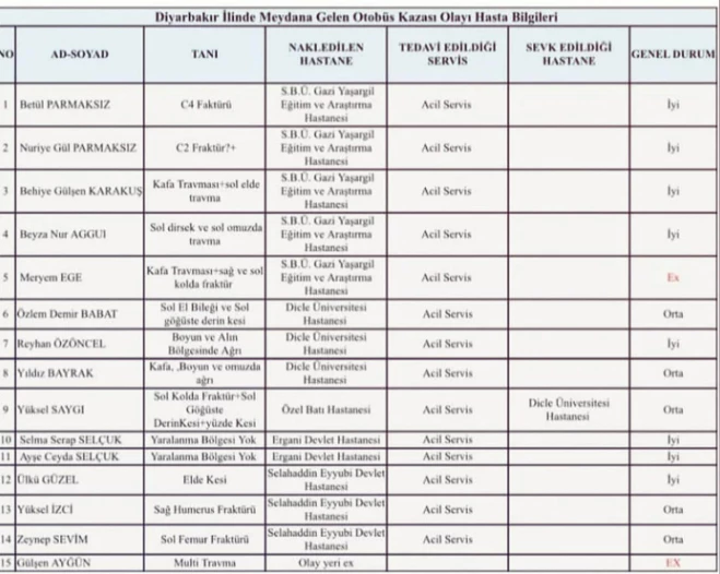 kazada yaralanan, Betül Parmaksız, Nuriye Gül Parmaksız, Behiye Gülşen Karakuş, Beyza Nur Ağgül, Özlem Demir Babat, Reyhan Özöncel, Yıldız Bayrak, Yüksel Saygı, Selma Serap Selçuk, Ayşe Ceyda Selçuk, Ülkü Güzel, Yüksel İzci, Zeynep Sevim'in Hastanede tedavisi devam ediyor.